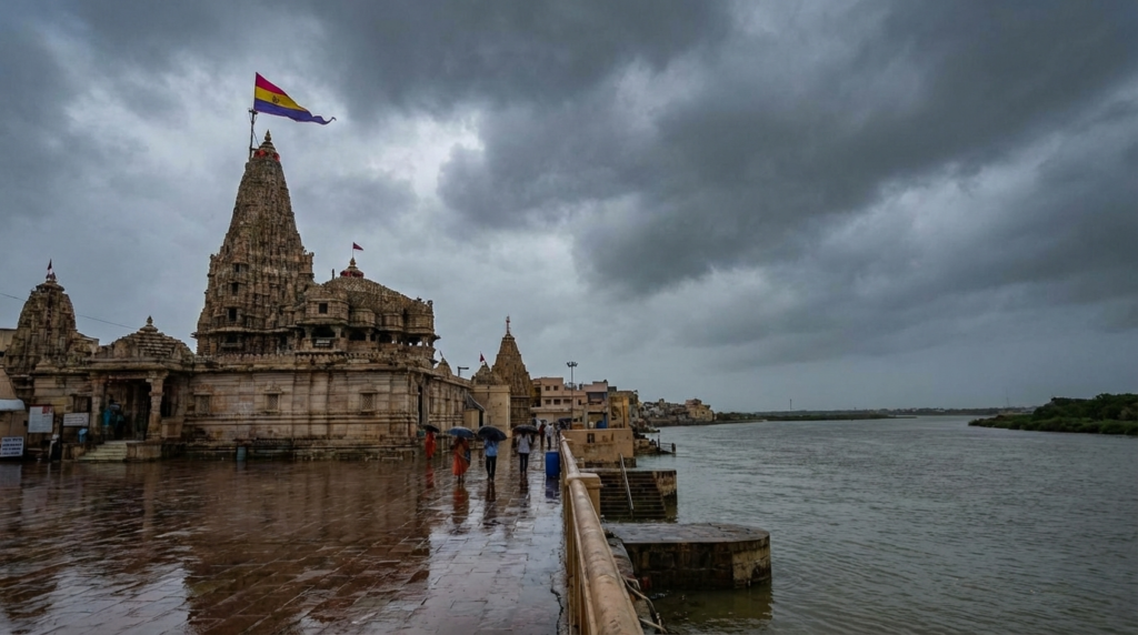 The southwest monsoon arrives on Dwarka’s Arabian Sea coast in late June and brings heavy rainfall, rough seas, and dramatically lush surroundings through September. The dwarka climate during this period is warm and very humid, with periodic heavy downpours. The Gomti Ghat and seafront areas can flood during peak rainfall days, and boat services to Beyt Dwarka are frequently suspended due to rough seas.